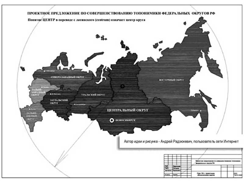 Существует множество идей перенесения центра экономической и политической активности на восток - в Западную или Восточную Сибирь, Забайкалье или на Дальней Восток. Одна из них принадлежит Ю. Крупнову, полагающему, что именно юг Западной Сибири должен стать не только географическим, но и политическим и экономическим центром России. Для начала он предлагает изменить названия федеральных округов, привязав их к географическому центру страны, находящемуся в Западной Сибири[3].