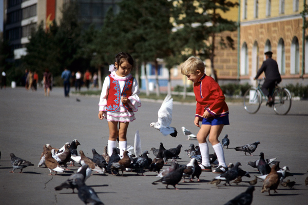 Казахская девочка и русский мальчик кормят голубей на площади Ленина в Целинограде. Фото: Владимир Федоренко / РИА «Новости», архив