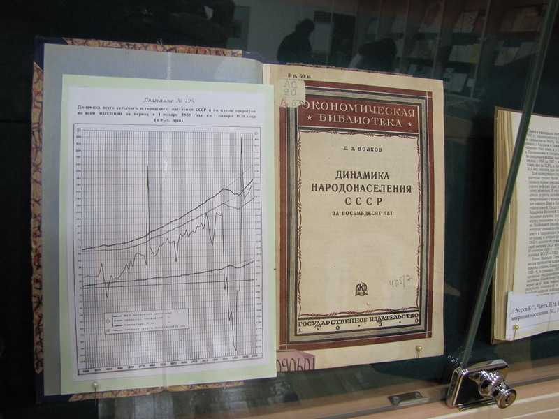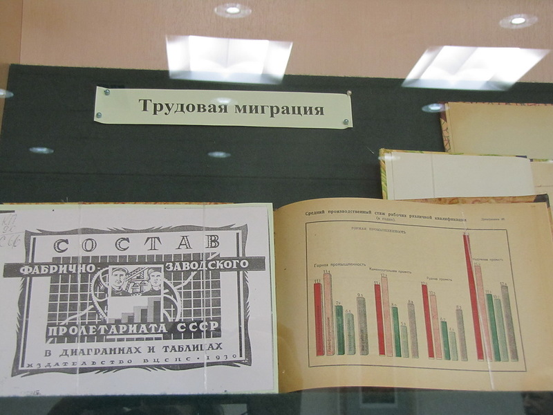 В 1930-х гг. в экономике труда стал употребляться термин «перераспределение трудовых ресурсов», подразумевавший обмен рабочей силой между центром и периферией, между отдельными регионами, а также между отраслями народного хозяйства. Раздел выставки посвящен работам по статистике труда известных демографов А.С.Рашина и С.Г.Струмилина.