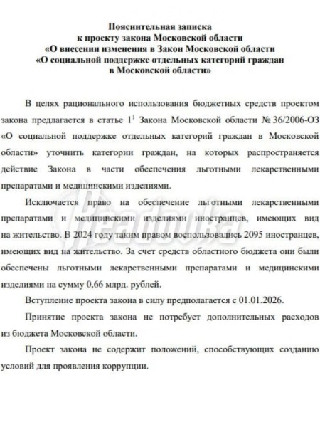 Интернет-издание Readovka сообщает, что иностранцев, имеющих вид на жительство, перестанут обеспечивать льготными лекарственными препаратами и медицинскими изделиями в Московской области. Законопроект об этом внес в Мособлдуму губернатор региона Андрей Воробьев. Поправки должны вступить в силу с 1 января 2026 года.