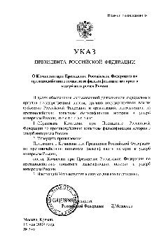 1. Образовать Комиссию при Президенте Российской Федерации по противодействию попыткам фальсификации истории в ущерб интересам России.