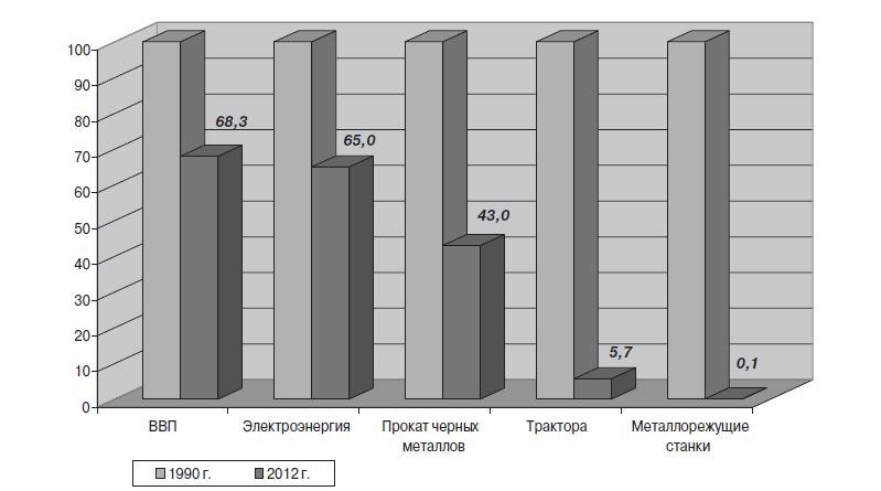 Объем ВВП в 2012 году составил лишь две трети от уровня 1990-го. Причем деградировала и структура промышленности: доля машиностроения снизилась до 9 процентов (в экономически развитых странах этот показатель 30— 60 процентов), в то время как доминирующее положение заняли отрасли по добыче и первичной переработке сырья.