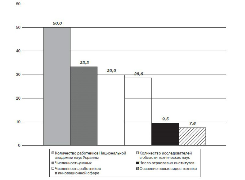 Фундамент прогресса экономики Украины составляла наука. Украина занимала 7-е место в мире по мощности научного комплекса, из 26 миллионов человек трудоспособного населения в науке и научной инфраструктуре было занято 500 тысяч человек, 3,1 процента ВВП шло на ее финансирование. Разгром науки за последние двадцать лет наглядно ви- ден на рисунке 2. 10 тысяч активных, способных ученых покинули страну, сотни тысяч ушли в примитивный бизнес, на рынки, огороды, вышли на пенсию. Сотни тысяч талантливых молодых людей в отечественную на- уку не пришли. В 2012 году на финан- сирование науки из госбюджета было выделено лишь 0,29 процента ВВП. В результате наука утратила свою эко- номическую функцию и в настоящее время с трудом выполняет лишь соци- окультурную. Как следствие, в пять раз (с 56 до 11,2 процента) упала доля ин- новационно активных промышлен- ных предприятий (в ЕС она составля- ет в среднем 60 процентов). Прирост ВВП за счет внедрения новых техно- логий на Украине в 2012 году составил лишь 0,7 процента (тогда как в разви- тых странах — 60—90 процентов).