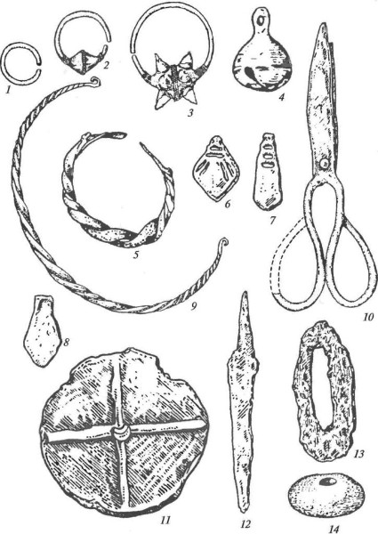 Половецкий период. Украшения и бытовые предметы: 1,2— серьги; 3 — «шипастая» серьга; 4 — бубенчик; 5 — витой браслет; 6-8 — амулеты-подвески; 9 — шейная витая гривна; 10 — ножницы; 11 — зеркало; 12 — нож; 13 — кресало; 14 — пряслице