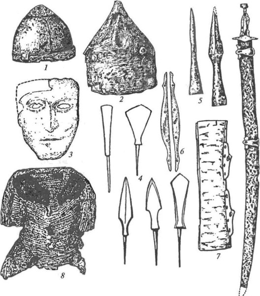 Половецкий период. Вооружение: 1,2 — шлемы; 3 — железная лицевая маска; 4 — наконечники стрел; 5 — наконечники копий; 6 — костяные накладки от колчана; 7 — колчан {реконструкция); 8 — кольчуга; 9 — сабля