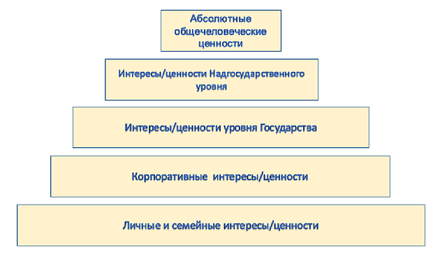 Возвращаясь к пирамиде ценностей, на надгосударственном уровне можно отметить интересы и ценности других сообществ – например, руководства транснациональных корпораций, руководителей транснациональных финансовых групп и кланов. Это руководители структур, которые ведут борьбу за ресурсы, имея для этого наднациональные рычаги – рычаги транснациональных корпораций, имеющих представительства и сотрудников по всему миру. На этот уровень, вероятно, следует вынести и ценности мировых религий. На самой верх иерархии вынесены общечеловеческие ценности, которыми человек пользуется в том числе, помещая контент в социальные сети и исходя из своего отношения к их значимости: «Не лжесвидетельствуй», «не разжигай расовой ненависти», «не оскорбляй национальных и религиозных чувств» и т.п.