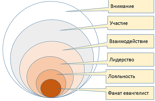 Процесс формирования суперфаната имеет стадии от внимания к участию, взаимодействию, затем к лидерству, лояльности и, наконец, к тому, чтобы стать суперфанатом, евангелистом, приверженцем, бренда.