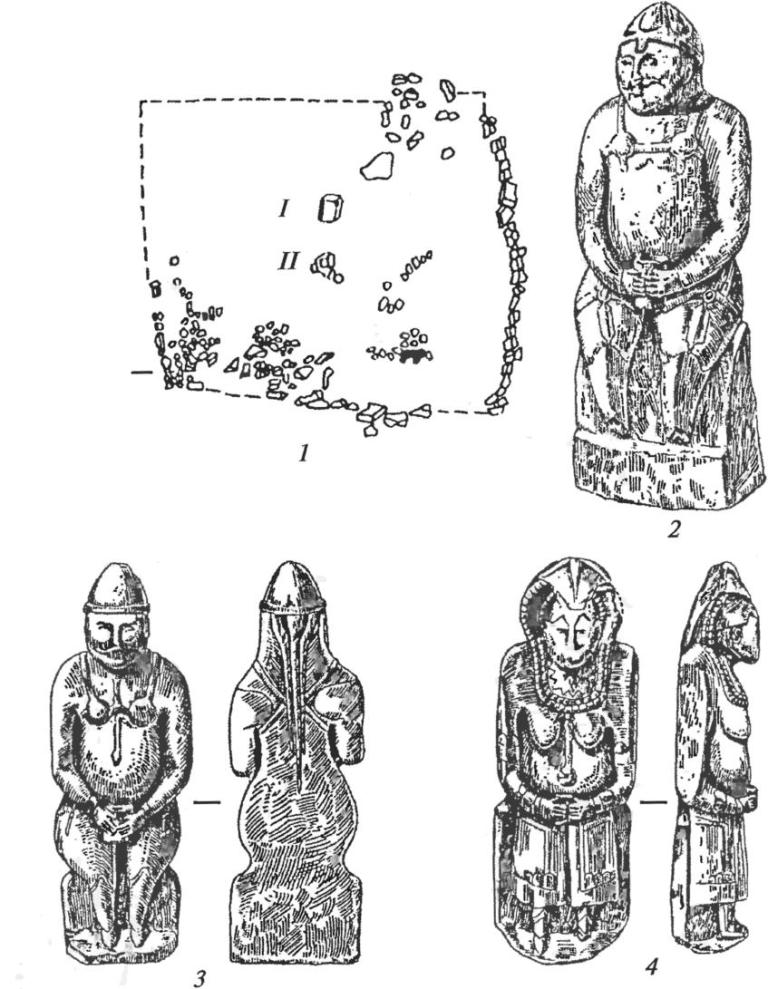 Половецкие каменные изваяния: 1 — план святилища и схема расположения изваяний; 2, 3 — изображения воинов; 4 — изображение женщины