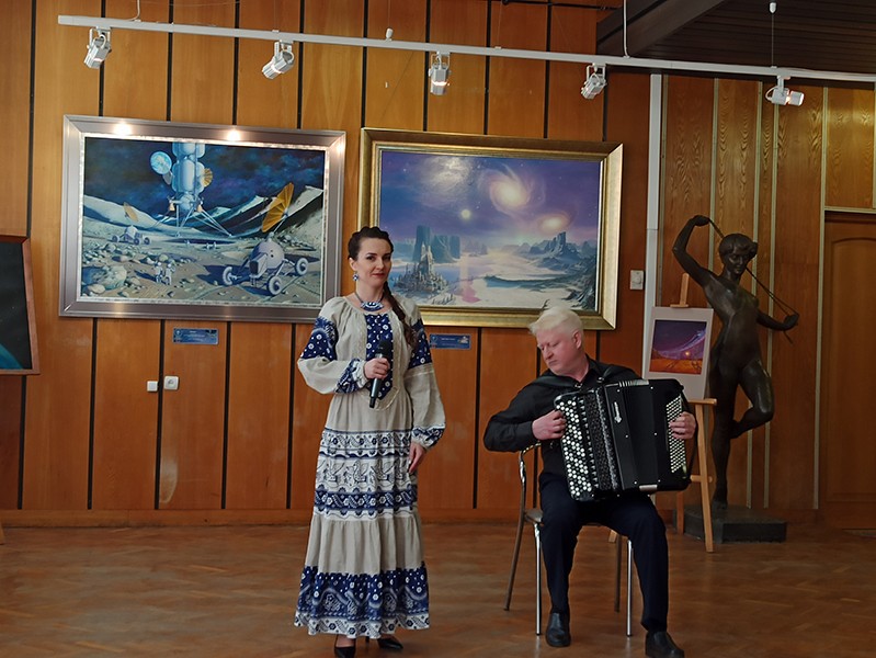 На выставке в Доме космонавтов представлены полотна известных московских живописцев Г.Корягина, М. Кабыш, В. Щербины-Сибирского, а также большая коллекция картин талантливого художника и рок-музыканта из г. Энгельса Саратовской области С.Крайнева.